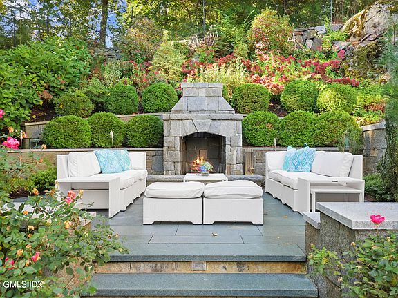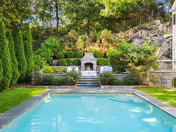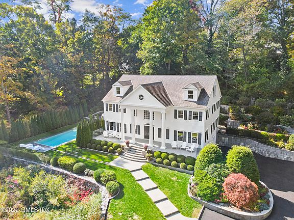 Prime Round Hill Road location boasts six-bedroom Colonial set back on 1.49 acres at the end of private cul-de-sac featuring entertainer's outdoor oasis with pool, waterfall, expansive terrace with stone fireplace and kitchen just minutes from town. Striking double height entry with sweeping staircase introduces a great floor plan with living room, dining room, wood paneled office, eat-in kitchen and family room with French doors to outside terrace all with high ceilings. Second floor offers spacious primary suite with fireplace, spa bath and large walk-in closet; en-suite bedroom and two bedrooms with hall bath. Exquisite renovation on top floor as well as lower level features flexible open plan with rec room, second office/homework room, bedroom and full bath and light-filled walk-out lower level with French doors to pool area, gym, butlers pantry, mud room, laundry room, Porcelanosa bathroom as well as a bedroom with own entrance, tons of storage plus attached 3 car garage.