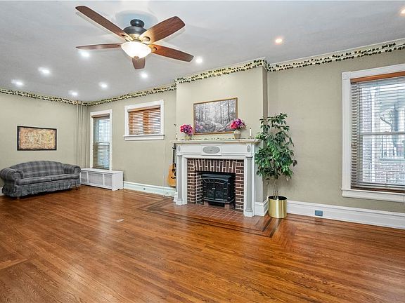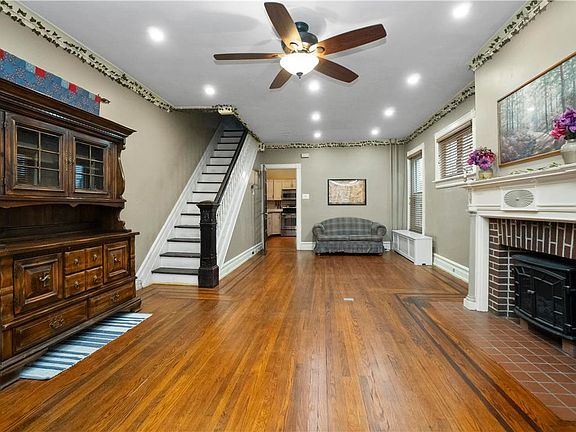 This 5 bedroom 2 full bathroom home is spacious and close to downtown shops and restaurants. The living room has beautiful hardwood floors with an electric fireplace. The ceilings have updated lighting fixtures which allow for nice bright lighting. The updated kitchen includes stainless appliances and an island with overhang. There is a full bathroom and the laundry on the first floor beyond the kitchen. The second floor has three spacious bedrooms all with hardwood floors. The rear bedroom has its own private balcony which overlooks the neighborhood. The third floor has the two remaining large bedrooms. Two of the bedrooms have large built-in closets with drawers. And for those snowy days, there is a well needed parking pad for three cars along with an oversized one car garage.