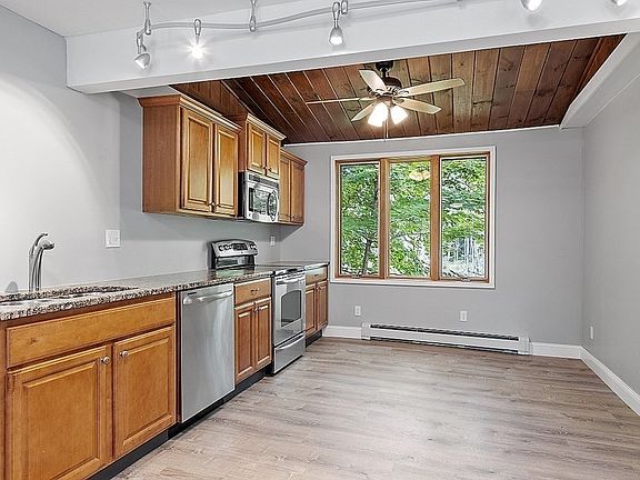 • Features: Ceiling Fan(s), Vaulted Ceiling(s), Flooring - Laminate, Countertops - Stone/Granite/Solid, Chair Rail, Exterior Access, Open Floorplan, Stainless Steel Appliances