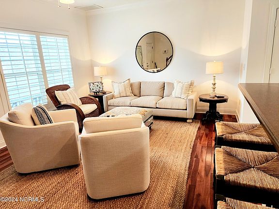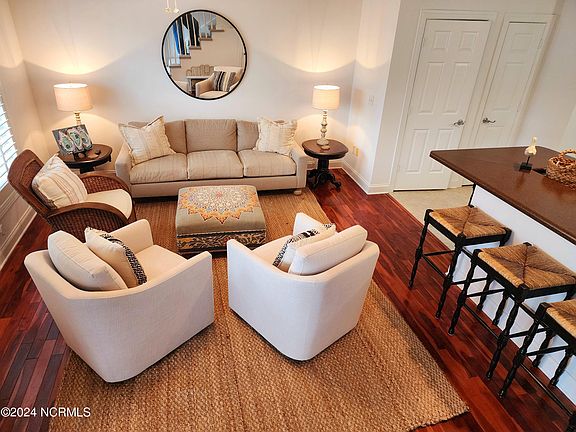 WELCOME HOME to The Hammocks at Port Swansboro, a gated community of Charleston-styled townhomes! This turn-key updated two-bedroom beauty is now available in this friendly, desirable community. This home is inviting, stunning, and bright. Covered porches on the front lower and top levels offer views of the beautiful pool and clubhouse. Either level is a great place to sit, relax, and just breathe! Open your front door to enjoy 9 ft ceilings, crown molding, hardwood floors, and wide baseboards in your spacious open-concept living/kitchen/dining area. The large kitchen has plenty of cabinets and counter space. The lower level includes a laundry closet with full-size stacked washer & dryer, a pantry, a storage closet under the steps, and a convenient half-bath for your guests. A nice deck is just off the kitchen for your grilling pleasure! Venture upstairs to two spacious bedrooms each boasting newer Berber carpet and private full baths. The premier bedroom has French doors that open up to a spectacular inviting view! Both bedrooms are spacious with large deep and tall closets. Both bedrooms have pool views! The community has a gorgeous clubhouse with a fitness room, kitchen, and gathering space. The meticulously kept pool area with an outdoor kitchen is yours to take advantage of. What more can I say? OH YES! LOCATION! 2 miles to your historic district of the Friendly City by the Sea, 5 miles to the Emerald Isle Bridge, 12 miles to Jacksonville, and 1.5 miles to Hammock Beach State Park. PS> New roof and gutter guards installed in 2021. A new indoor air handler was installed in 2023. What are you waiting for? Call!