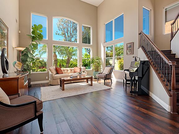 Enjoy the better life at this exceptionally upgraded luxury home in Rancho Santa Margaritas sought-after Paragon neighborhood, where beautiful panoramic views of Saddleback Mountain, soaring cathedral ceilings and newly remodeled rooms enhance everyday living. Impressively proportioned at approximately 3,157 square feet, the two-story residence hosts 4 bedrooms, including one on the main floor, and 4 baths that have been fully remodeled with sleek countertops and sophisticated cabinetry. Double doors open to a formal entry that introduces a stunning living room with two-story ceiling, clerestory windows, and a dramatic staircase and grand hall balcony above with wrought-iron railings. Hardwood flooring continues into a formal dining room with custom chandelier, and large tile complements the fireplace-warmed family room, breakfast nook, and a remodeled island kitchen with granite countertops, wood cabinetry, a pantry, and stainless steel appliances. Enjoy hill, mountain and evening-light views from large windows in a master suite that boasts a walk-in closet and a luxe bath, a custom vanity, soaking tub and separate shower. Recently painted, the exterior features an attached 3-car garage. Grounds span nearly 7,254 square feet and are graced with colorful roses, mature palms, a covered rear patio and spacious lawn. No Mello Roos, and access to numerous community pools, lake, beach club, tennis courts, parks - while walking distance to the top-ranked Arroyo Elementary School.