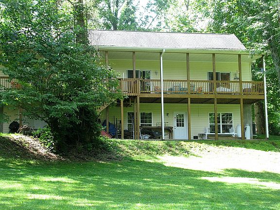 Hayesville NC Creek front Home..This 3/2 home overlooks beautiful Shooting Creek, which offers great times swimming, tubing and fishing. The full lenght covered deck on back of home offers a great place for grilling, relaxing or listening to the noisy creek. The front covered deck is the perfect place to relax or read your favorite book. The home features an open great room with sliding doors to deck, and a corner propane fireplace, dining area and kitchen. The kitchen is divided from the living and dining area with a free standing curved bar with seating for 4 and kitchen prep area on other side. The kitchen offers a new stainless stove, microwave and a nearly new stainless refrigerator. The utility room off the kitchen has a deep utility sink and washer/new dryer. The master ensuite has a large bedroom, walk in closet, bath with double vanity, shower and garden tub. There is also a guest bedroom and a smaller bedroom with walk in closet. The master and guest bedrooms both have double sliding doors which open to the large deck. There is a full (1560 sq. ft) partially finished walk out basement plumbed for another bath. The lot is .66 acres and definitely one of the nicest on Shooting Creek. Home sits high so no problems with flooding and the sloped yard to the creek is the perfect place to play a game of football, horseshoes or add a fire ring beside the water. Home come fully furnished. Just bring your toothbrush. High speed fiber optic internet available. Showing by appt. only please. 828-835-2149.