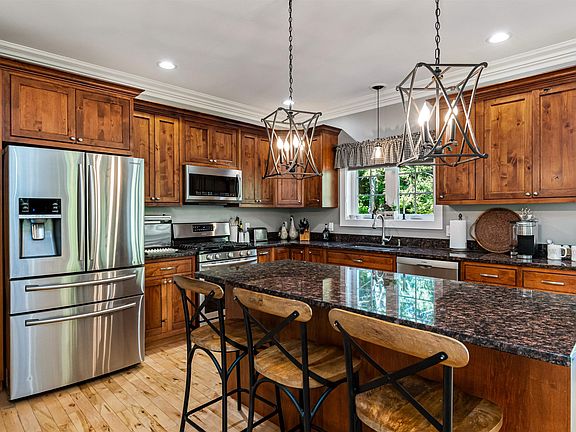 Beautifully maintained 3-bedroom home with deeded lakefront access to Arrowhead Mountain Lake—ideal for fishing or boating from a dock. Built in 2015, this meticulously maintained retreat is minutes to Burlington, St. Albans, and Smugglers’ Notch. Inside, enjoy an open layout with gleaming hardwood floors, crown moulding, custom built-ins, and a pellet stove. High-end finishes throughout. Stunning granite kitchen flows to a formal dining area. Spacious entry area with built-ins, office area and powder room. Upstairs is a generous master bedroom suite with walk-in tiled shower and walk-in closet, plus two additional bedrooms with custom closets and full bath. Enjoy beautiful lake, mountain and nature views from the many windows in this house. Outside offers exquisite gardens, a large wraparound front deck, spacious back deck, stone patio, and built-in firepit—perfect for entertaining. Two-car heated garage, custom storage and an EV wired outlet. Separate large shed with extra large entry door.