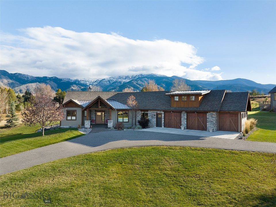 We are delighted to present this stunning custom home nestled at the base of the Bridger Mountains in beautiful Bozeman, MT. The home is the perfect embodiment of Montana's warmth and elegance, with lovely wood and stone accents throughout. The main level of the home features an open concept living/dining/kitchen with incredible mountain views, a primary suite with spacious bathroom and dual closets, an office with custom built-ins and valley views, and two additional bedrooms with full bath. A unique three season room with wood burning stone fireplace creates space for elegant summer gatherings and cozy fall nights by the fire. The walkout daylight basement has a sitting area with a large guest suite, plus additional room for expansion with a large unfinished space and lots of storage. An immaculately clean heated three car garage offers plenty of parking/storage space, and has bonus trusses with a dormer that can be finished for more square footage or used as additional storage. The grounds are truly park-like, and the sitting area with fire pit makes for a great place to convene with family and friends. Perfectly sited on 1.6+/- to enjoy panoramic views just a stone's throw from town, this is a truly rare offering!