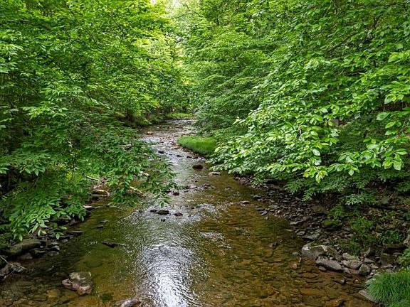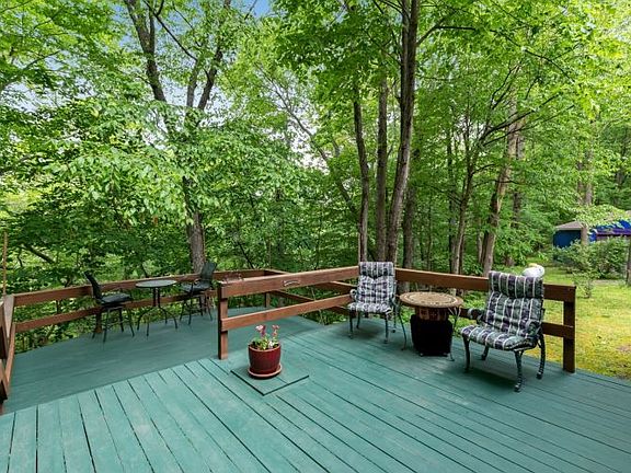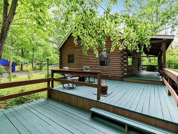 Spectacular Log Cabin Retreat! Private 3.72 acres has a truly magical waterfront setting overlooking Spruce Run Creek. Fantastic covered front porch and multi-level deck w views of the stream is perfect for entertaining. Completely move in ready this charming home has an open and flexible floor plan. Impressive vaulted ceiling Great Room w wood-burning stove, garden windows, easy care wide plank flooring and ceiling fan. Kitchen w knotty pine cabinets, quartz topped center island, decorative tile backsplash and breakfast bar. Sunroom opens to patio. Updated bath has granite topped custom cabinetry, tub shower and decorative tile accents. Vaulted ceiling bedroom has a loft and 2 big closets. Basement w large recreation room and a full bath. Lush landscaping. Over-sized detached 2-car garage w storage. Great schools and commute