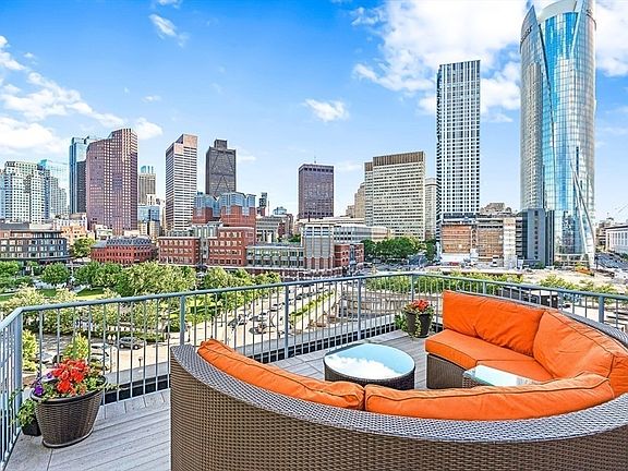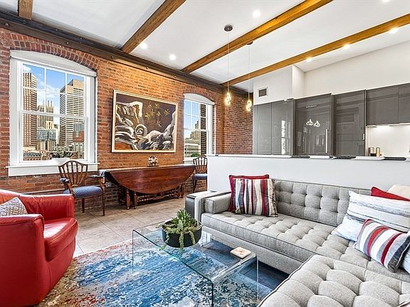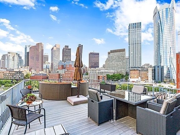 Contemporary Penthouse loft features 11ft. ceilings, Brick and Beams, deeded covered parking, over-sized windows and roof deck with unobstructed City views. Open kitchen with high gloss cabinetry, quartz countertops, high-end appliances and gas stove & wine fridge. Living area with custom flooring, lighting, and spectacular views of downtown Boston. Private walk-out roof deck with head-on views down the Greenway, Downtown Boston, and beyond. Spa-like Bathroom features custom tile-work with heated floors, marble accents, floating vanity, and upgraded LED. An ideal floor plan offering a plus area with built-in Murphy set. Full size washer/dryer, Central air, and deeded covered parking. A boutique building, converted from a warehouse and offers a common roof deck, elevator, and professional management. At the entrance of the North End, next to the Waterfront, Financial District, Government Center, TD Garden, Faneuil Hall, North Station, Beacon Hill, and all major transportation points.