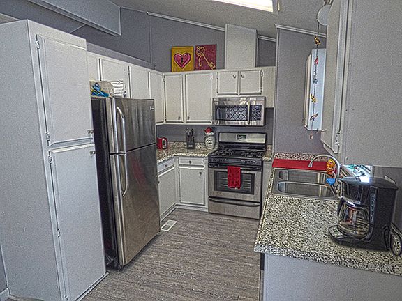 This charming home is something special! The remodel includes new flooring throughout, new paint inside and out, remodeled kitchen and bathrooms. The vaulted ceilings give the home an open and airy feel. Kitchen and bathrooms are truly lovely. Kitchen comes equipped with beautiful stainless steel appliances. Separate pantry and laundry room provides additional storage as well. The water heater is only a few years old and the home has central AC! Outside you will find views from the large refinished covered deck. Large fenced yard. There is also a storage shed and a side by side, two-car, covered carport. Very private yard! Lot Rent: 691/mo | Includes: None