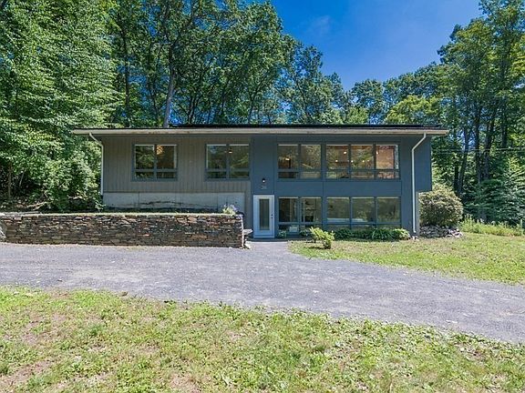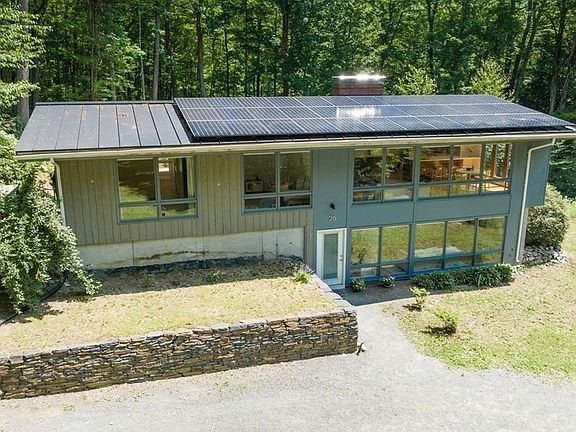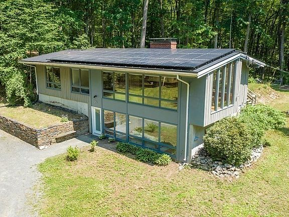 Stunning mid-century modern home on 13 acres surrounded by natural beauty. Extensively and thoughtfully updated, this home offers peacefulness, simplicity and functionality. The abundance of natural light and oversized windows will captivate you. Entering the main floor you are greeted by high ceilings, hardwood floors and the renovated (2014) bright and airy kitchen w/ plenty of seating. The kitchen flows to dining area w/ newer windows and comfortable living room w/ fireplace. Down the hall are 3 spacious bedrooms, full bath w/ gorgeous tile and en suite half bath. Large bonus area downstairs is perfect for hanging out or office space. Convenient mudroom w/ room for storage. Outside find the expansive and incredibly designed cedar deck (2020) and magnificent backyard. Cedar outdoor shower is not to be missed. Other updates include metal roof (2015), owned solar (2016), water heater (2019) and more. Sought-after Leverett location w/ privacy minutes to Amherst and all area amenities.