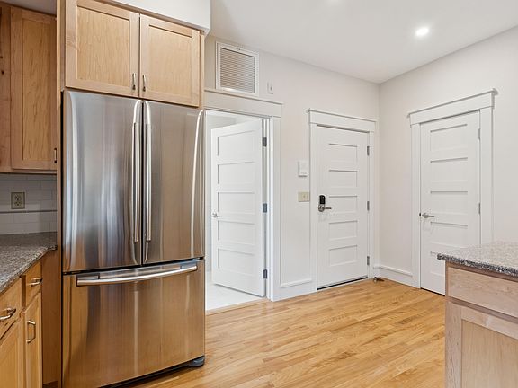 Wooden beams and intricate stained glass windows frame open, flowing living spaces in this commanding 3 bedroom, 2.5 bath residence. The main floor features open kitchen, dining and living areas with a convenient half bath, while upstairs bedrooms each enjoy full baths. Architectural charm is reflected through coffered ceilings and paneled doors.
