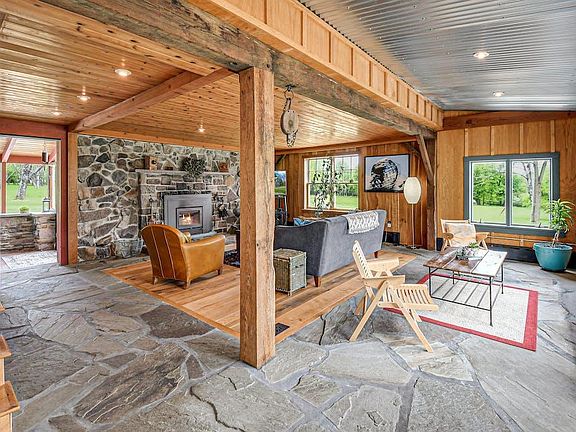 - Description: Irregular PA bluestone and reclaimed random width oak floor; corrugated metal, hand-hewn oak and Douglas fir ceiling with exposed angled beams and posts; exposed stone wall; reclaimed board & batten oak barn wall; floor-to-ceiling fieldstone fireplace