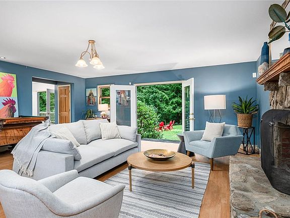Rare find, super quiet! Just outside the city limits; only five minutes from downtown Asheville in the lovely Chunns Cove area. Short-term rentals allowed (buyer to confirm). One-level living with three spacious bedrooms and two bathrooms on a private, .92 acre lot. Cozy main living room with gorgeous, wood-burning stone fireplace with French doors to level yard with original stone walls. Open kitchen, dining, and family room has a vaulted ceiling. Original oak hardwood floors in bedrooms, dining and family room, laminate flooring in living room and kitchen. Primary bedroom has an en-suite bathroom with a double vanity and ceramic tile. Fun vintage 1960s hall bath. Huge daylight basement with laundry hookup and half bath potential (toilet in place) ready for your finishing. Property includes beautiful woods with native plants, a level yard for pets or play, and a view of Town Mountain. Gorgeous stone patio overlooks mountain creek. Wraparound deck is great for outdoor entertaining.