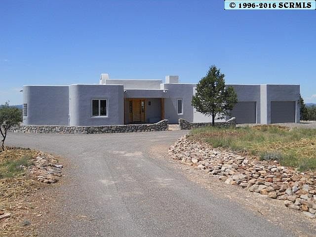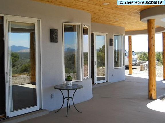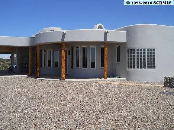 Stunning Southwest Contemporary set on a 12.4 acre hilltop property with views in every direction, and a rock-lined level driveway! This home gracefully combines comfort, livability, and noteworthy architectural design. Beautiful tile floors, Kiva fireplace, custom glass-block and tile baths, handmade sinks, 5 burner gas cooking surface, oversized laundry, delightful tiled breakfast bar. High wood-paneled ceilings, skylights, solid wood doors throughout, log posts supporting covered patio roofs. Low maintenance natural landscape with good amounts of defensible space around residence. Too many features to name! Solid value now and for your future!