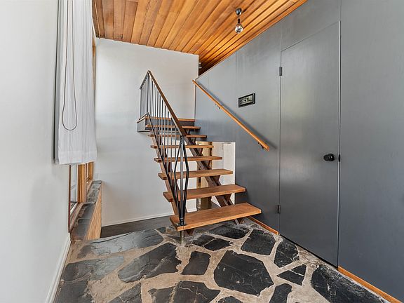 - Description: Floating stairs to upper and lower level. Storage closet. Floor to ceiling windows. Stone floors
