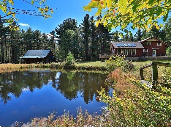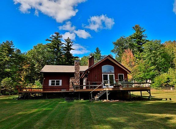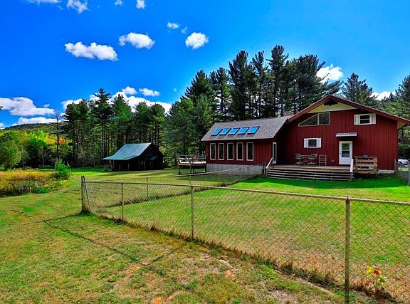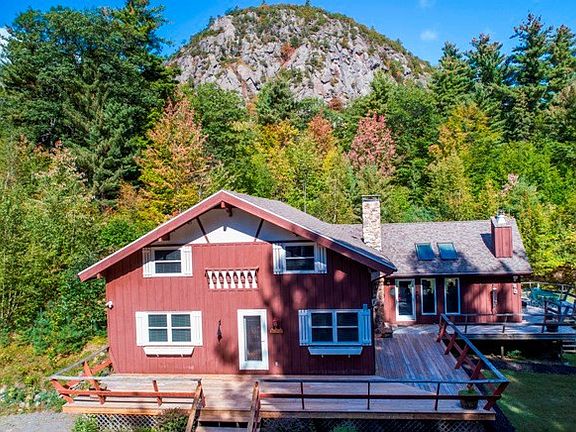 This Adirondack Chalet sits privately by itself and has Haystack Mountain with it monumental stone face in the backdrop. It features an open Kitchen, Living, and Dining room floor plan with a spacious wrap around deck. Its attractive sun room is finished with knotty pine, a wood stove set upon a stone hearth, 7 skylights, and in floor radiant heat. The kitchen has a cathedral ceiling with an attractive cedar shake roof facade, hardwood cabinets, a sit up bar and hardwood floors. A stone fireplace with a wood stove insert warms Living/Dining area and Twig and Post railings lead you to the second story bedrooms. There is a 24 x 34 four stall horse barn with electric and overhead hay storage.