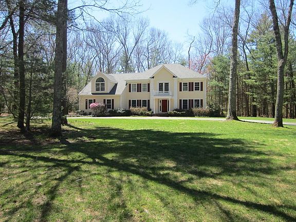 Nestled on a quiet wooded acre and a half, this impeccably maintained Colonial delivers everything you could want. A stunning 2-story foyer welcomes you to a formal living room and generous dining room with a bow window letting in lots of light, perfect for family gatherings. Large kitchen with granite countertops, stainless steel appliances, center island and sun-splashed breakfast area opens to family room with floor to ceiling stone fireplace and skylights. Adjacent sunroom has sliding doors opening to bluestone patio for summer barbecues, surrounded by stately and beautiful tall trees. A private office completes the first floor. Four generous bedrooms are located on the second floor, including a master suite with walk-in closet and master bath. Immaculate lower level ready for your personal touch. Bucolic views from every window with plenty of space for your growing, active family with Drumlin and Codman Farms nearby. Delightful!