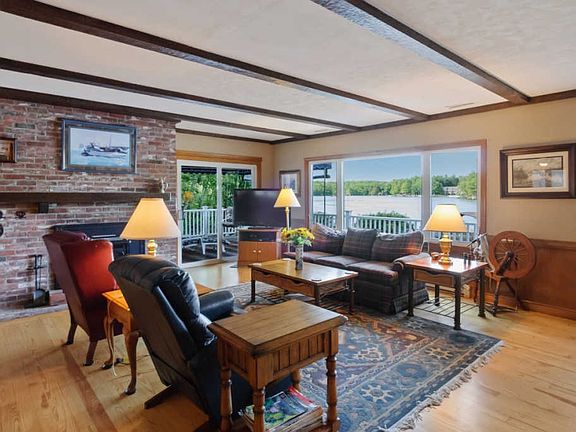 Set just 20 feet from the shore of Lake Winnipesaukee, this wonderful lakeside home features a sandy beach and a 12 x 50â deepwater dock. Inside youâll find two master suites: a first floor master with built-ins and an attached ¾ bath, the second floor master suite has two separate baths and a wall of windows overlooking the lake. This home has hardwood floors, beamed ceilings, central air conditioning, and a nicely laid out kitchen with granite countertops, tile floor, and a desk area for planning meals. The large deck off the living room offers views of the water with a section shielded from the sun by an awning. Also on the 1.5 acre property are two cottages â one that sleeps 6 and another that sleeps 2 â that can be used as rentals or overflow when entertaining. Rental history for 2020 was over $40,000. There is a detached 3-car garage, paved driveway, perennials, and 145â of water frontage. Road frontage is approximate. Winter Harbor is a desirable area and is located just minutes from downtown Wolfeboro and all amenities.