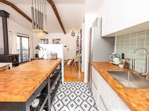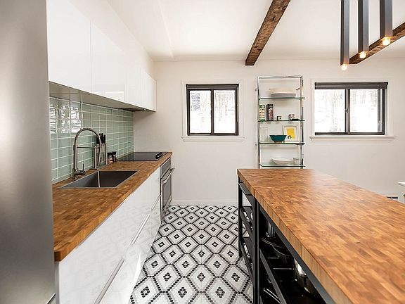 Welcome to the Davos Woods House. A professionally renovated three bedroom two bathroom home with a modern twist on a 1970's classic. This wooded property is surrounded by lush woodland and beautiful vistas. Enter into the open plan living and entertaining area which features cathedral ceilings and exposed beams. All new windows and doors with solar insulating shades, and your new wood stove, make this the area to be in on cozy winter evenings. The brand new chef's kitchen features white lacquer cabinetry, butcher block counters and a glass tile backsplash. Stainless steel appliance package features a full sized oven, microwave, dishwasher, hood, and large refrigerator. There is also an oversized kitchen island with a butcher block top and ample storage underneath. The deep stainless steel farmhouse sink with spray arm faucet is situated nicely between two countertop prep areas. Glass induction cooktop has a powerful range hood above. Lovely tile floors complete the kitchen and allow for easy clean up. Formal dining area is framed by north and west facing windows and comfortable fits a large table and chairs. Open plan living area is framed by a new sliding glass door to your entertaining deck which has stairs to the rear yard. To the left of the living area is a master suite with bathroom and two additional bedrooms. All bedrooms have hardwood floors, double hung closets and modern finishes. The ceramic tile master bathroom has a full sized tub, and a large vanity with a stone countertop. Several storage closets throughout afford room for all of your needs. On the lower level is a very large windowed room which can be converted into a family room, den, or additional entertainment area. Laundry corner with a brand new washer and dryer are tucked away by the door to the garage. The garage has a new automatic door and keypad which allow you to pull right in on cold winter nights. Total of 4 parking spaces, with one indoor and three in the driveway. Newly painted exterior woodwork and masonry. This lovely compound comes with two additional buildable lots for the savvy investor looking for an income producing investment. Lots are BOH approved with municipal sewer and water hookups. Municipal water and sewer means this is a low maintenance house, with town water and sewer, no well or septic worries. 90 minutes to NYC. Convenient to highways, local lakes, ski areas, state parks, Resort World, Bethel Woods and the charming Catskills villages of Mountain Dale and Hurleyville.
