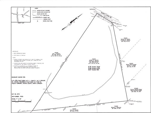 Thanks for your interest on property posted for sale in Alexis, NC. I've attached the boundary images from the Gaston County GIS showing contours and from Maps showing roadside and aerial views. I've also attached a survey drawing for reference. The property is 9.75 total acres and offers a large, cleared footprint for a variety of uses. Wooded boundaries around most of the property offer peaceful privacy. The property has already been permitted with the county for septic and well but not installed, and underground power has already been brought in to a private transformer just behind the large farm shed erected at the end of the gravel drive (not shown on images). Farm and earthmoving equipment currently located on the property can be negotiated with the purchase. Thank you for your interest! Please let me know if you have any questions.