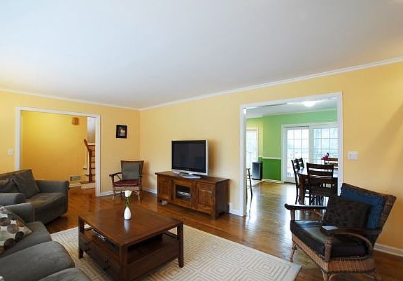This 5 bedroom/2.5 bathroom home is spacious, bright, and charming! The living room features large windows, crown molding, and a beautiful brick fire place with built in book cases on either side. The open kitchen and dining area are perfect for entertaining, and have brand new sliding glass doors leading out to a large gated deck and back yard. The renovated kitchen boasts granite counter tops, stainless steel appliances, and a breakfast bar. A family room with wall-to-wall carpeting is located on the ground floor and leads to the home’s two-car garage. Need storage space? Not a problem when you have a large finished basement with a washer and dryer, and plenty of room for storage. Other highlights of this home include re-finished hardwood floors throughout, recessed lighting, and an easy commute to Manhattan, with public transportation just minutes away. Short Sale. Subject to Bank Approval.