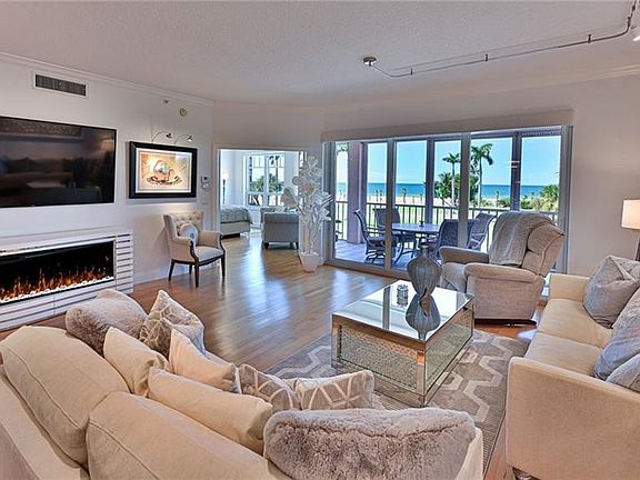 This light coastal two bedroom two bath Barefoot Beach Club beach condo offers it all: the most desirable location with wide beach views of sugar white sand & clear turquoise water of the Gulf of Mexico, beautiful sunsets from inside and on the large screened lanai, convenient club with swimming pool and fitness center on the beach right across the street, another new swimming pool just a short walk away at building 263 will be under construction soon, the ability to lease a boat dock within the community, tastefully updated interior including a light color palette, wall paper, kitchen with wood cabinetry, white countertops, stainless steel appliances, and a built-in wine cooler, countertops & fixtures in baths, wood flooring, crown moldings, impact glass, electric shutters on the lanai, fireplace with large screen tv and the upscale turnkey furnishings may also be purchased for immediate move in. Building 260 offers residents and guests substantial parking and the most central location to the amenities. Barefoot Beach is Collier County’s premier gated Beach to Bay community featuring Royal Palm lined brick paver streets, 2 security guards 24 hours, one of the highest ranked beaches in the country, no public parking within the community and simply an awesome place to live. Barefoot Beach Club is a well managed & maintained family friendly Condominium Association. Option to join the Club at Barefoot Beach (located within the community) which offers casual and fine dining restaurants, pool & beachside food, drinks and chair service, indoor & outdoor bars, tennis courts with pro & a full events calendar. (waitlist with usage during wait period). Barefoot Beach Club Condominium in Barefoot Beach is centrally located to dining, entertainment, golfing, arenas in Naples and Bonita Springs and is close RSW Airport, the Promenade, Coconut Point, Mercato & Waterside Shops and Old Naples. The Barefoot Beach condo club, pool and fitness is included with the condo.