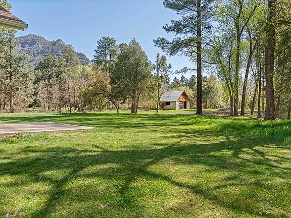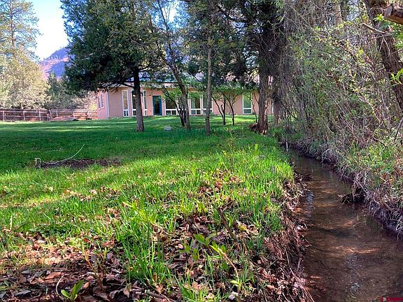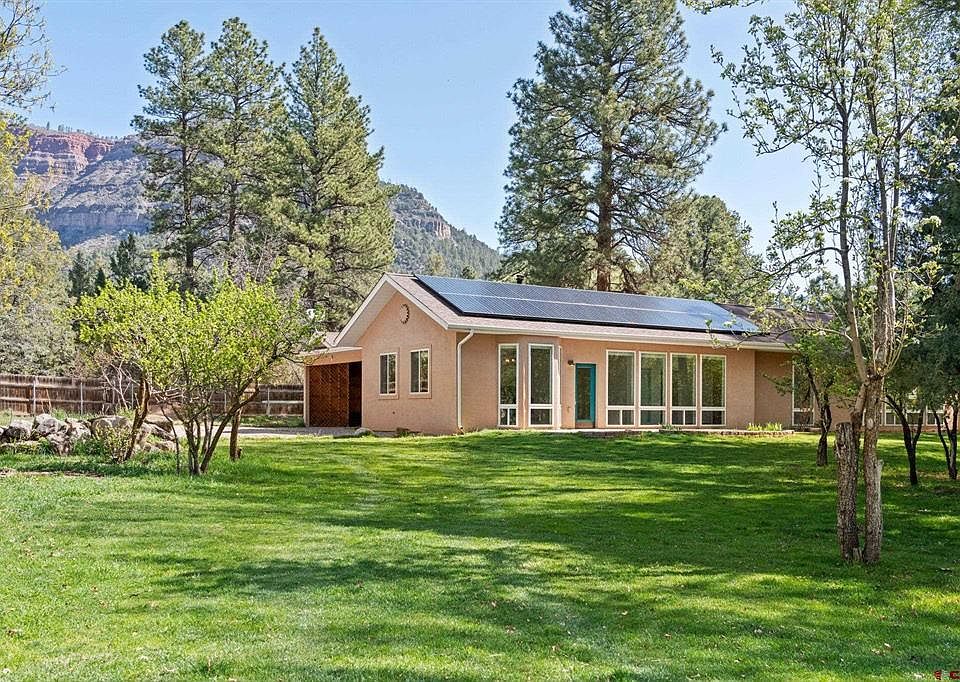 Nestled on a green and lush 1.5+ acre lot, this loving home features a wall of windows stretching from the kitchen and living space to the primary bedroom that makes it feel as though you are living in the beautiful natural setting outside your doors. The Dudley-Kerr ditch flows along the property line, resembling a seasonal creek, with lush vegetation providing privacy from neighboring properties. The kitchen has a large walk-in pantry and is open to the living room, which has a vaulted ceiling and woodstove with glass front to provide ambiance and warmth on cool nights. The primary suite is generously sized and features a vaulted ceiling, 5 piece remodeled bathroom with a walk-in tiled shower and soaking tub surrounded by white stone and a wall mounted floating fireplace, walk-in closet, and private door to the backyard. The second bedroom also has a sizable walk-in closet and direct access to the second bathroom with a tiled walk-in shower. The primary bathroom was completely remodeled by the current owners, and both the kitchen and second bathroom have been updated. The home also features an air exchange/whole home ventilation system and a central vacuum system. GROUNDS & OUTBUILDINGS: The property has a full in-ground sprinkler system, and multiple varieties of fruit trees, including multiple plums, apples, pear, and a giant apricot tree at the back of the lot. There are multiple outbuildings, including (1) a 336 square foot schoolhouse type building that could be used as an office, media room, guest room, workshop, woodshed, or more, (2) detached garage, (3) storage shed, and (4) chicken coop/small barn. LOCATION: Only 1/4 mile off CR 203, 2 minutes to Hermosa Creek Grill, less than 5 minutes to Durango Hot Springs and the amenities at PJs Market, Animas Wine & Sprits, and Trimble Hardware, 15 minutes to downtown Durango, and about 20 minutes to Purgatory Ski Resort. Private road - Please Observe the 5 MPH speed limit! SOLAR FEATURES: The expansive windows serve as a passive solar system, warming the stained concrete flooring during the winter months when the sun is low in the sky. The home also has a solar system to help offset the monthly electric costs.