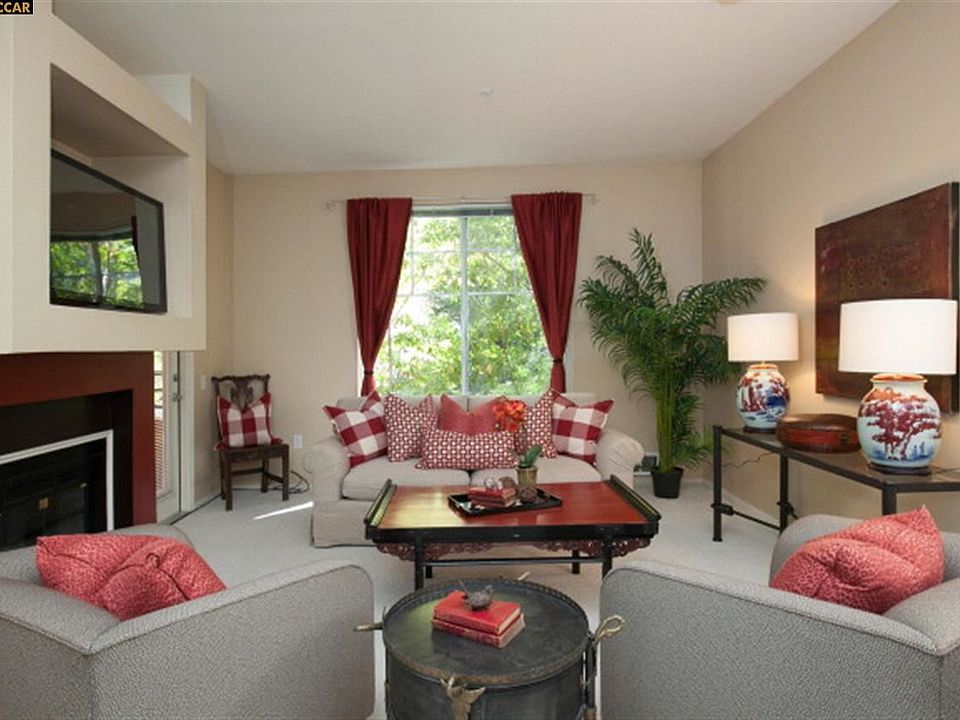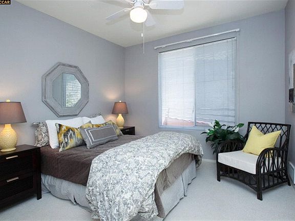 In quiet rear of the complex with private view of hills. Stainless steel kitchen appliances, updated bathroom and Calif. Closet in master closet. In unit laundry and storage. Refrigerator, washer, dryer included! Great commute location, Express AC Transit to SF from front gate. Pool, spa and gym too
