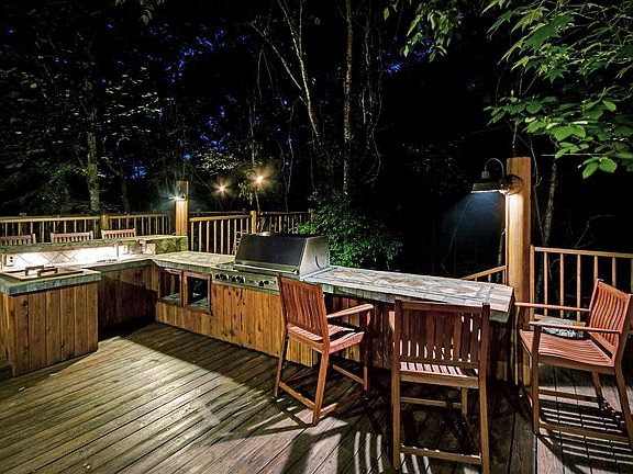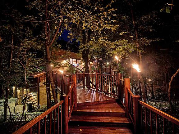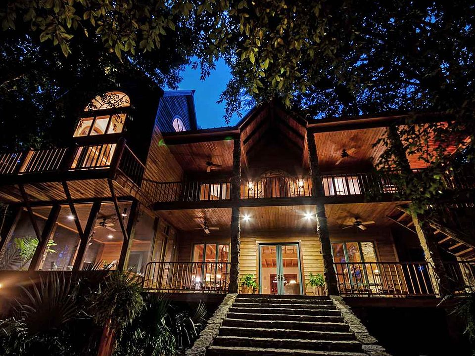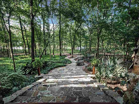 We invite you to TrailâEUR(tm)s End. This unique home, is the result of 2 years of design by the owners, & over 6 years of construction. This house faces north in a heavily wooded area on a 40+/- acre lake to provide complete privacy. Access for visitors is by way of a 1/3 mile front drive partially lined in stone with parking areas showcasing lake views & for the family there is a back drive leading directly into the 3-car garage. Walkways around this home are designed to create the feel of a meandering stream, which separates around boulders and trees which will take you to the front porch or a board-walk terminating at a deck on the lake for spectacular sunsets and fishing. From the front porch you will notice a âEURœcedar treeâEUR staircase giving the effect that the house was built around the tree. The 9âEUR(tm) x 4âEUR(tm) arched âEURœmainâEUR front door is old tidewater cypress trimmed in stone. The design and fixtures of the house were custom-designed many being crafted on-site to incorporate curves and angles unique in their presentation and in keeping with natural elements. Upon entry one is captivated by a 26-foot vaulted ceiling made of cypress, a spiral staircase, a massive fireplace, family room and garden room with a pond-like sunken spa surrounded by a tropical garden and natural stone. The dining room entry is framed in 150-year-old Amish hand hewn barn beams with red cedar pegged beams crisscrossing the ceiling. The garden room has pecky cypress walls, a fireplace near the spa and a full-service bar with bar type seating viewing the salt-water aquarium. The bar top is Spanish cedar trimmed in mahogany with a hand carved wood sink. The kitchen is well-equipped for even the best of chefs consisting of a center island, stone vegetable sink, Viking cook top, double ovens, Subzero and granite extracted from a cave in Brazil. The master suite showcases a 26-foot cypress ceiling and a large chandelier made of mother-of-pearl. The balcony places you high among the trees and the fireplace will definitely enhance any evening. Additional master features include a built-in armoire that conceals a spiral staircase and small kitchen/entertainment area. The master closet is fully-equipped utility with under-counter washer and dryer plus a built-in ironing board. The master bath has heated travertine/stone floor, his and her vanity areas with Spanish cedar counter tops and custom-made light fixtures, natural stone sinks, a jetted tub and a natural stone wall which extends into a walk-in natural stone shower affectionately called the âEURœcaveâEUR. The third-floor loft, which can ALSO be accessed from the hidden staircase in the master suite consists of a library and fitness room offering views that add an entirely new and intriguing dimensions of the southwest scene. There is even a 4th level reading loft. The deck offers an outside kitchen containing a 52âEUR Viking grill, a stainless steel sink, custom-made ice chest, and bar-counter seating for 6. The game room is supported by hand-hewn 12-inch square timbers and 3-inch x 12-inch hand-hewn exposed beams forming the ceiling. One of the focal points of this room is a 12-foot wide wood-burning stone fireplace with gas starter. The room also boasts a dining area and a complete kitchen/bar facility with copper countertops and back splash. One of the favorite features on the first floor is a large screened porch with âEURœrustedâEUR pressed metal ceiling and 2 ceiling fans. It overlooks the lake and is designed to bring the outside in. Also on the 1st floor is a large utility room with a built-in sewing area, dog shower, under-counter washer/dryer, built-in ironing board and a sports closet with built-in drawers, compartments and heated/cooled boot locker. Space just does not allow for all the details so come see Trails End and don't forget to ask about the 6 stall barn that includes a 2 bedroom