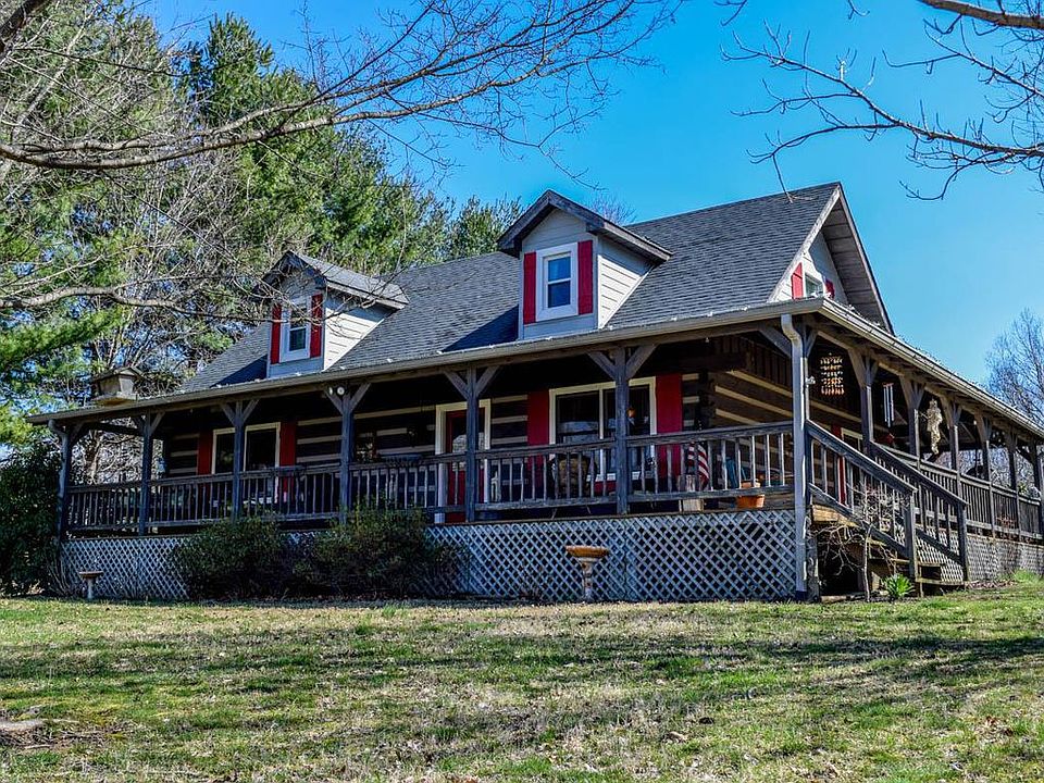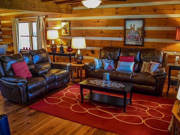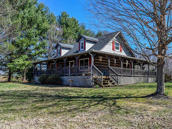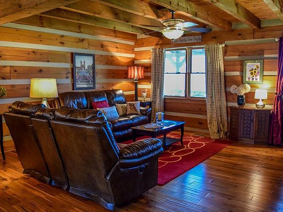 Nestled in a private setting of natural beauty is a cozy log home with a wrap porch and detached barn/garage/workshop...the second story could be converted to living area. Acacia wood floors and pine ceilings. Master on main. Fully fenced. Gorgeous area! City water hooked to house. Well water hooked to outside faucets.