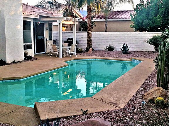 Welcome to MERANO and one of the best locations in the desert. This charming pool home is nestled in a quiet interior location of a cul-de-sac. Mountain views to the south only enhance this properties appeal. Upgrades to both kitchen and master bath will give the next owner a great starting point for their finishing touches. Two patio covers to enjoy the backyard and pool. LOW HOA dues and close to everything.