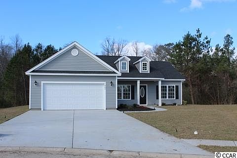 Popular Hickory 70, with open floor plan, split bedrooms, large relaxing front porch situated on 1/2 acre, cul-de-sac lot with private wooded rear yard. Dining room has tray ceiling. Spacious kitchen has wrap around breakfast counter, breakfast nook, lots of counter top space and solid wood cabinets with crown molding and knobs, stainless steel appliances. Private 12' x 14' Master suite with vaulted ceiling, ceiling fan w/light, huge L shaped walk-in closet, two sinks, raised height vanity, garden tub with obscure privacy window to let light in, plus a separate walk-in shower. Rear screened porch and concrete patio. Smooth ceilings, 30 year roof shingles, cottage style doors, gutters, sodded yard with sprinkler system, fully finished 22' x 22' garage with automatic door opener, pull down stairs to attic storage. A country quiet community located within 20 minutes of N Myrtle Beach and the beach. Within minutes of downtown Loris, the Loris nature Park, Loris Community Hospital, and McLeod Family Health Center. Large home sites, lake and wooded views. Video is for illustrative purposes only and may be of similar home built elsewhere. Square footage is approximate and not guaranteed. Buyer is responsible for verification.