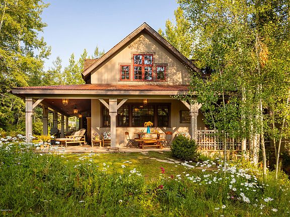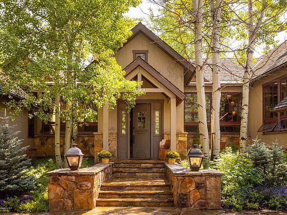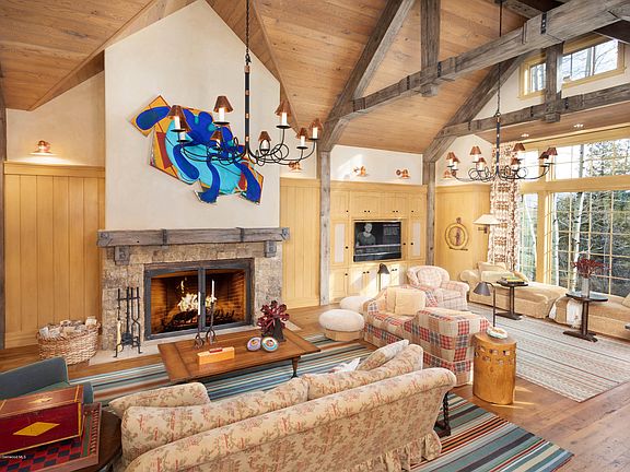 An inviting, warm farmhouse-style home which celebrates the rich history of ranching in the Roaring Fork Valley. Inspired by an Americana theme, this home is layered with reclaimed wood floors, hand-hewn timbers, millwork, custom-hammered door hardware, and rare reclaimed stone pavers, setting the scene for memorable fireside gatherings of family, grandchildren and friends. Unlike so many spec houses available in Snowmass, this home was designed for these sellers, was made to feel welcoming, and is filled with heart. Virtually everything in home was either custom-designed, from the furniture to bath vanities and tiles, or represents the finest antiques, circa 1850. Great room, dining area and den with floor-to-ceiling library were all designed to entertain a crowd, or for curling