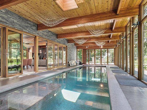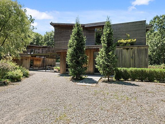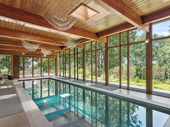 Architect designed, contemporary luxury mountain getaway-compound in the heart of NY's Hudson Valley. Main home & guest house for rental as a package. The main, 4 bedroom, 4 bathroom house is perched high and features a euro-sleek, functional, Alessi+Valcucine kitchen open to living and dining area with wood burning fireplace. Adjacent indoor pool opens to outdoors w/ deck & kitchen/great room with glazed doors. Upstairs bedrooms - some featuring en-suite baths - offer vaulted and beamed wood ceilings. There's a bright and airy feel with extraordinary amounts of glazing, natural light and treetop canopy views from many rooms. A lower level has laundry and bonus spaces / playroom. Conditioned exercise, yoga, meditation, or art studio sits above the 2 car garage and is connected to the main house by an outdoor, upper-level sculptural steel suspension bridge. Large, open, level lawn, bluestone patios and wood decks for outdoor entertaining and summer activities. Separate guesthouse is a short distance within the property, through forested specimen plantings, and boasts 2 bed, 1 bath, full kitchen, wood-burning stove and open porch for relaxation in nature w/ scenic views. Security gate at end of long drive, the 8 acres is is deer-fenced and has a walking trail. Tesla charger in garage, elevator in main house, many ADA accessible features. This one-of-a-kind, luxury compound is private, comfortable and its curated design and setting elicit complete inspiration.