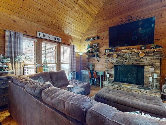 Beautiful Cabin at the end of a Cul-de-Sac and so much privacy, you will enjoy sitting on the back deck watching the deer walk by! When you walk in from the covered front porch and step in the front door you will love the high ceiling and all the beautiful wood throughout the cabin. Living room, Kitchen and Dining room has an open floor plan and hardwood flooring. Master bedroom on the top floor features a jetted tub as well as a walk-in shower. The 2 additional bedrooms are on the main level and a full bathroom. The home has new Board and Batton Vinyl siding and a new roof. The basement gives further options for expanding the home as the walls have already been constructed.