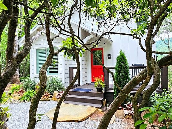 Discover the charm of this FULLY furnished luxury cabin nestled on 1.96 acres, surrounded by lush mountain laurel and professional landscaping. This 2 bedroom/2 bath home sits upon an encapsulated crawl space with dehumidifier. The main level has 1 large bedroom w/walk-in closets, beamed ceilings w/white washed T&G walls, Plantation Shutters, & pine wood flooring. The 1st level has a tiled bath w/tub/shower w/an easy glide glass enclosure, & linen shelving. The kitchen is on the 1st level and is equipped w/a High-End refrigerator, microwave, dishwasher, gas oven range, including a washer & dryer on level two! This kitchen has rich wood counter tops, an island, & a large pantry. The dining area has access to the deck for outside dining if desired. The great room has vaulted ceilings, built-in shelving, a Vermont Castings wood-stove and a cozy entertaining space! The upper level is spectacularly designed and is comprised of the Primary Suite w/tiled shower, laundry, view deck, & walk-in closet. Adjacent to the Primary bedroom is a study w/a vaulted ceiling & an adjustable shaded “Skylight”, and a TV. This home has FAST "FIBER OPTIC" internet! A perfect "full-Time" residence or VRBO!
