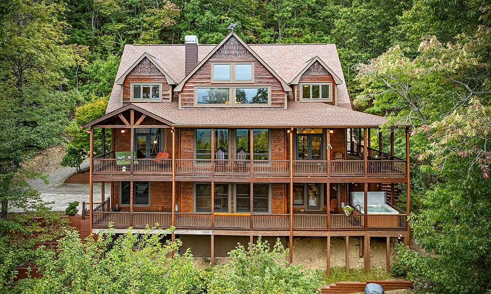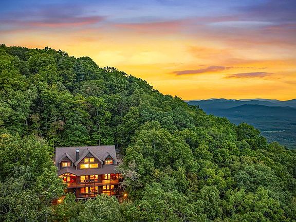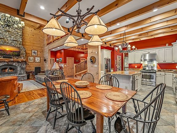 A Grand Lodge Retreat with Million-Dollar Views! Escape to a one-of-a-kind mountain retreat that feels like it belongs in a National Park. Set at the end of a private gravel road and bordering U.S. Forest Service land, this 4BR/4.5BA home blends rustic grandeur with modern comfort, offering rare privacy and sweeping year-round mountain views. Inside, you're welcomed by tile floors, a copper sink half bath, and timeless craftsmanship. The great room impresses with soaring beams, a massive stone fireplace with wood-burning insert, and a dramatic chandelier—creating a lodge-like space that's both awe-inspiring and inviting. The open kitchen and dining area features granite countertops, stainless appliances, gas range, pantry, and generous laundry. Multiple doors lead to expansive covered porches, perfect for savoring the views. The main-level primary suite boasts exposed beams, panoramic vistas, and a spa-like bath with double vanities, walk-in tile shower with dual heads, jetted tub, water closet, and large walk-in closet. Upstairs, a catwalk leads to two ensuite bedrooms with tiled showers—one with a bonus room for office, nook, or guest space. The terrace level offers a game room with pool table, wet bar, mini fridge, and another ensuite bedroom, plus access to more covered porches and a hot tub with mountain backdrop. A 2-car basement garage and front carport provide ample covered parking. Whether a private estate, family getaway, or luxury rental, this lodge-style retreat with million-dollar views is truly extraordinary.