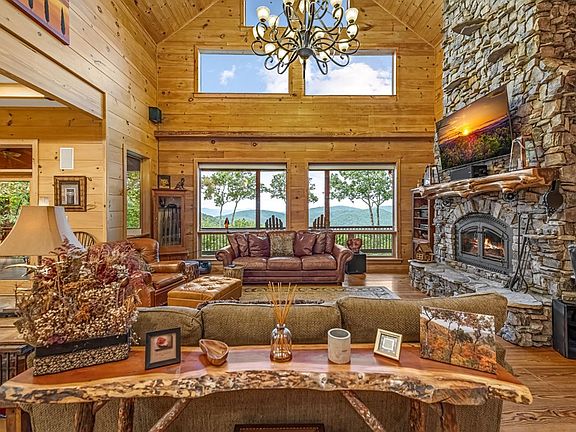 Sweeping year-round mountain viewsExposed beamsMain-level primary suitePanoramic vistasSoaring beamsDramatic chandelierExpansive covered porches