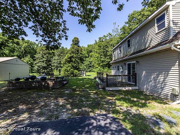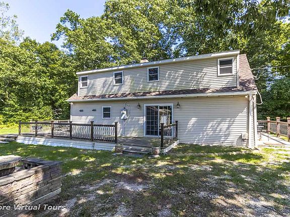 Situated on 10.85 acres of partially wooded land and open space, this home is planned to accommodate multi family living and or in-law quarters either or the first or second floor. There is a bedroom and bath on each floor. Porch, deck off the sliding doors opening to a patio for more seating. The rear of the house also includes the deck for a more private atmosphere. A detached garage with ample parking and space. A must see to appreciate.