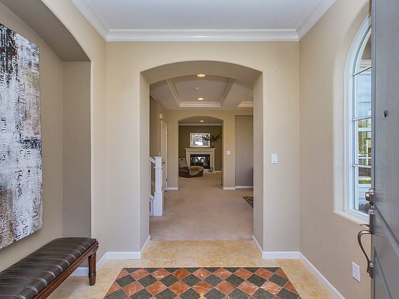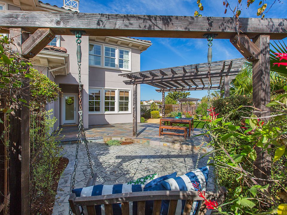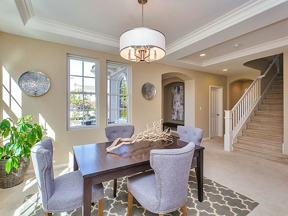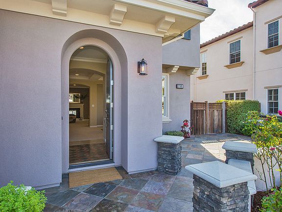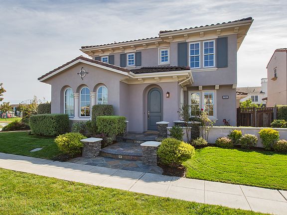 Built in 2008, this stately Bayport home in Alameda’s vibrant West End has wonderful curb appeal and is situated on an incredibly large corner lot. The home features a traditional Mediterranean look on the exterior, with a tile roof, arched front door, arched windows, shutters and many pleasing architectural details. Inside, the contemporary design takes into consideration today’s lifestyle and modern needs. The home features five bedrooms, three bathrooms, a formal dining room, kitchen/family room, an open chef’s kitchen and breakfast nook, a dedicated laundry room, an attached, two-car garage and an exceptional backyard and garden. The large, formal dining room on the right features a striking recessed ceiling with crown moulding and pendant light. Four double-hung windows on one wall, and two windows on another wall face out to the front terrace. A versatile alcove gallery wall is large enough for a wide sideboard or displaying art. Beyond the dining room is the family room, kitchen, and breakfast nook that opens out to the backyard. The expansive chef’s kitchen has a wonderfully open design that includes a kitchen island/breakfast bar with a black granite counter that can easily seat several people. A large, walk-in kitchen pantry offers a great deal of storage space in addition to the many kitchen drawers and cabinets. Stainless steel GE Profile appliances include a side-by-side refrigerator, built-in microwave, and double ovens. A Broan stainless steel range hood vents a five-burner gas cooktop, and brilliant white subway tiles are complemented by rows of translucent glass accents tiles. A casual breakfast room next to the kitchen is flooded with light from the double-hung windows that offer views of the backyard patio and pergola. The breakfast room features a built-in sideboard with plenty of storage cabinets below, and glass-front cabinets above. A glass door exits to the backyard, and another door leads to the attached garage. The kitchen opens to a spacious family room that includes a handsome gas fireplace with an exceptional mantel and surround that is the heart of the room. An entertainment center alcove is to the right of the fireplace, and three large double-hung windows bring bright light into the room with views of the side yard. A light-filled bedroom and bathroom are located near the front entrance, perfect for guests. The bedroom has arched windows with divided lights, high ceilings, recessed lights, and a roomy closet. The nearby bathroom has tile floors, a vanity cabinet with a tiled top, and a walk-in shower with a tile surround and sliding glass doors. Upstairs, the master bedroom suite is located at the end of the hallway. This spacious, sunny bedroom features a recessed ceiling, and five double-hung windows that offer views of the open fields, wrap-around backyard and garden, and the Oakland Hills. The generous walk-in closet has a built-in organizer system. The spa-like master bathroom includes two separate vanities, cream-colored ceramic floor tiles, recessed lights, a built-in dressing table, a soaking tub and a private water closet. Two additional bedrooms are located across the hall from the master suite, separated by a bathroom. These large bedrooms are comparable in size, and each has a high ceiling with crown moulding, numerous windows for natural light, and generous closets with built-in shelf dividers. The large bathroom was thoughtfully designed for more than one person and includes a ceramic tile floor, a large, double-sink vanity and a tub/shower combination that can be closed off for privacy. The home’s fifth bedroom is at the top of the stairs and has French doors with divided lights, a pair of double-hung windows and an alcove for an armoire or to transform into a closet. This lovely bedroom is ideal for a home office or a second guest bedroom.