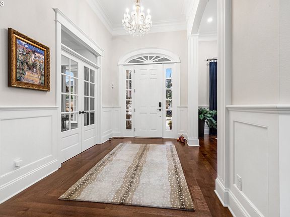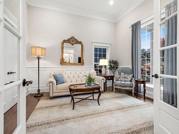 Southern charm meets modern flair, just blocks from Creekside Golf Club with no HOA! When you walk into this luxurious home, you immediately feel a sense of calm. The natural light is bountiful from the large windows and the grandeur of the 12-foot ceilings, accentuating the slab quartz countertops, custom cabinetry, and high end appliances in the spacious kitchen. Every thoughtful choice, from the custom crown moldings and real hardwood floors to the crystal chandeliers and high end fixtures, makes this home unique. Entertaining family and friends is a true delight with an open floor plan that flows seamlessly from the dining room to the large living room with a cozy gas fireplace. The primary bathroom is divine, with a huge shower and a gorgeous freestanding tub to melt all your cares away. Great care was taken in ensuring that the interior flows directly to the exterior, with patio doors that open to a backyard that is beautiful, serene, and low maintenance. Tackle any project your heart desires in your built-in shop - dust free thanks to the air filtration system in the 3-car garage, or practice your golf swing with a golf simulator (sold separately) in the comfort of your own home. This smart home can also control all lights and charge your electric car. The primary bedroom and two additional bedrooms are on the main floor, with a fourth bedroom upstairs with its own bathroom and living space that could be used as a guest suite. All this home needs is you!