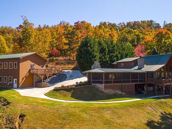 Incredible million dollar views from Brasstown Heights! This home has been customized for the ultimate retreat. You can practically live on the screened in porch (over 700 sq feet) with an outdoor fireplace! Open covered deck for unobstructed views. Second Structure is a raft room and workshop . The main level contains the master suite with its' own private screened in porch. 2 single attached garages on main structure. Upstairs the master suite is enclosed for privacy & has an additional porch. Basement is currently being used as an office but has an additional room for extra sleeping & a full bathroom. Wrap round deck on basement level. Detached garage & studio is fully heated/cooled and has incredible views! Too many features to list! Executive level retreat with a cozy, mountain chalet feel. Whole House Generator. Furnished
