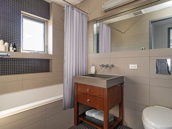 This apartment is a massive 1 bedroom located on the 6th floor. The apartment features a large open kitchen, with custom made walnut cabinetry, stone counter tops, and a mosaic steel tile back splash. The apartment features all luxury stainless steel appliances including Bertazzoni stove and range with vented hoods, and Liebherr refrigerator/freezer built in with beautiful custom walnut paneling. Apartment has a full size gas vented Washer and Dryer and boasts HUGE STORAGE space with its large walk in utility room that can easily accommodate suitcases, sports equipment, or other large items. The rest of the apartment has ample closet space including multiple walk in closets and full built in lighting. Bathrooms are magnificently designed and detailed including having radiant heated stone floors, large deep soaking tubs, all imported Italian tiles and Grohe Chrome fixtures. The apartment also features a private balcony with great open views and tons of light. Building includes a small fitness center and a common roof deck with spectacular views at no additional cost. The building has solid financials and very low monthly carrying costs.