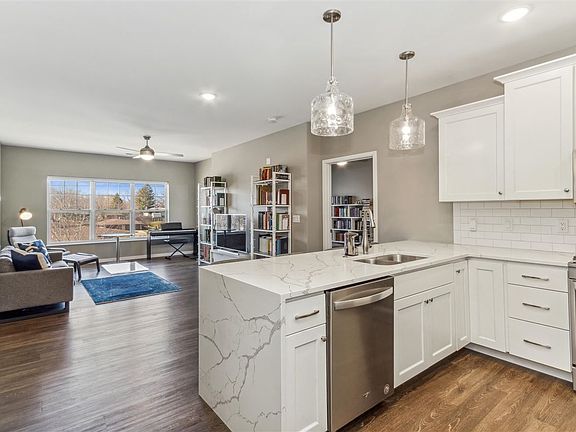 Introducing a stunning 2-bedroom 2-bath condo located on the top floor of Pine Grove Villas on the East Side of Iowa City. This lovely unit boasts high-end finishes and an open concept main living area with a kitchen overlooking the dining/living area, creating a perfect space for entertaining guests or relaxing after a long day. The kitchen is spacious for condo living and features quartz countertops with a contemporary twist, thanks to the stunning quartz waterfall breakfast bar/peninsula. Step outside to the covered balcony and enjoy your morning coffee. The large primary suite is a peaceful oasis with ensuite bath featuring a double vanity. Throughout the condo, you will find a feeling of warmth and comfort. The building includes an elevator, spacious lobby, secured entrances, workout room, and a secured underground garage for parking. This condo comes with 1 parking space in the underground garage.