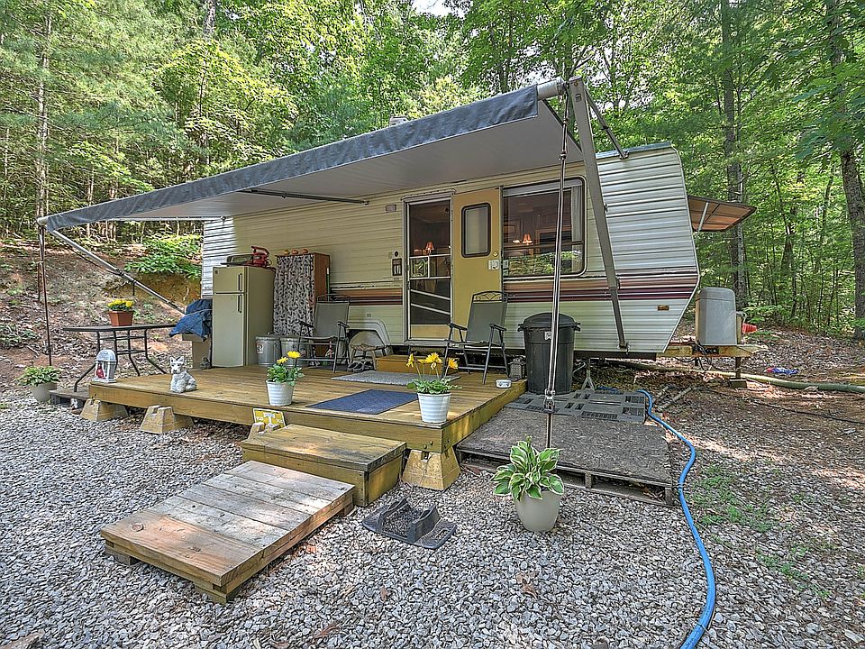 These 2 parcels are perfect for glamping in your own secluded get-away or live in the camper that is conveying while you build your dream home. The potential magnificent mountain view once cleared is unparalleled. There are underground utilities including water and electrical with two 30-amp electrical hookups - one for the camper and one for the RV spot. There is a storage building that has a washer and dryer hook-up as well. So many possibilities!