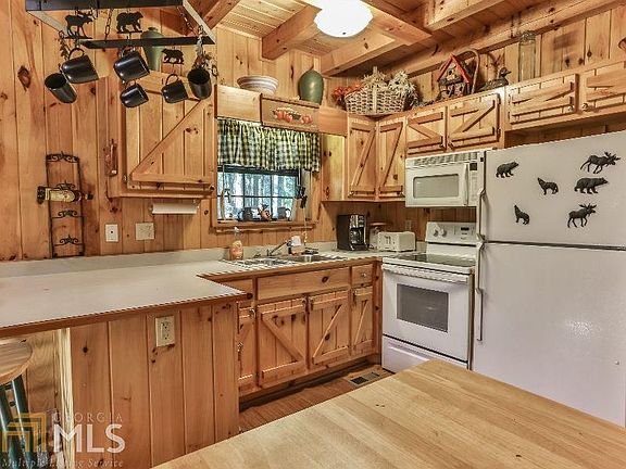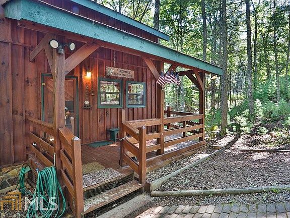 Do you want to have a getaway to unwind without breaking the bank? Small gated mountain community, 2 bedrooms, 1 1/2 baths-one is a loft bedroom with a half-bath. There is another bedroom and full bath on the main. Nice functional kitchen with breakfast bar, laundry closet on the main. 1/2 wrap around decks to enjoy the mountain views. Transferable termite bond. Recently pressure washed. Furnished - just move in and enjoy. Lots of wildlife and the community touches USFS. Three community lakes and deeded access to the Toccoa just around the corner from this cabin. Large lot may be able to subdivide and build another cabin - land is marked and goes from Ridgecrest to Sourwood. Gentle, easy access. Cabin has two driveways. Minutes to Lake Blue Ridge.