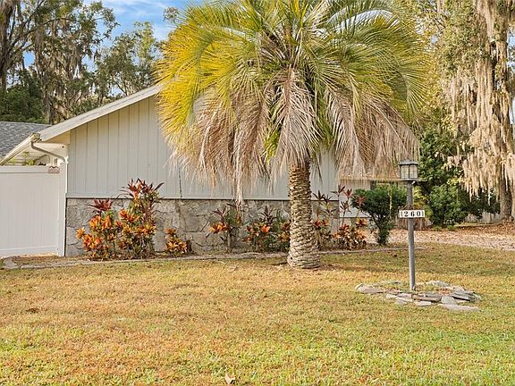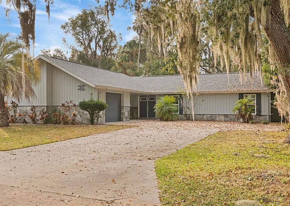 One or more photo(s) has been virtually staged. Beautifully updated 2BR/2BA, 1,640 sq ft home on a 0.44-acre corner lot in the Village of Picardy, featuring a new 2025 roof and a bright, open layout. The spacious living room showcases vaulted ceilings with exposed wood beams, tile flooring, and a striking stone wood-burning fireplace. The remodeled kitchen offers granite countertops, dark blue/white cabinetry, stainless steel appliances, breakfast bar, and pantry. The primary suite includes a walk-in closet and a modern bathroom with dual sinks and a glass walk-in shower with rain head. A tiled sunroom lined with windows provides extra living space year-round. Outdoors, enjoy a fully fenced backyard, pergola-covered patio, storage shed, side-entry garage, and additional parking pad. No HOA. Ideally located minutes from Hunter Springs, Three Sisters Springs, dining, shopping, and all that Crystal River has to offer.