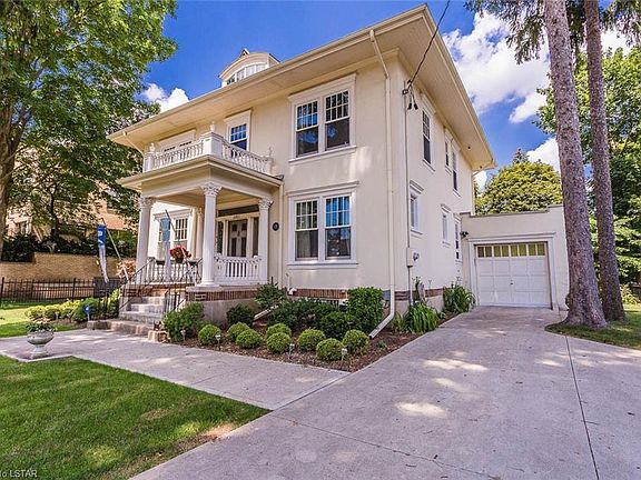 Prestigious Old North Georgian style 2 storey designed by noted architect William Murray for John Lindsay in 1928. This stucco home features portico entrance with fluted Corinthian columns which are echoed on the living room fireplace, extra wide soffits, arched dormer and balcony posts with urn trim. Enter into a tremendously generous foyer which welcomes you into this remarkable centre hall plan with inverted tray ceiling in both the living room and the dining room, main floor sunroom and updated kitchen with butler's pantry, private den with access to the rear yard and separate laundry porch. All windows have been replaced to maintain the original design, and the list goes on. Enjoy your tour through this exceptional home and the lovely property with several outdoor features including soothing fountain. ideal for entertaining or simply enjoying the peace and quiet of the rear yard oasis. A rare find in the heart of London which is exceptionally presented.