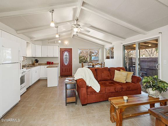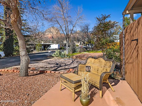 HONEY STOP THE CAR!!!! Darling bungalow manufactured home nestled in the heart of West Sedona! No HOA so Short Term Rentals Possible! Vacation Property Mgt. Co. estimates income between $44K-$35K. Small but mighty, this sweet thing offers open concept living with a combo of living, dining and kitchen all wrapped in one room! Sliders spill out onto a covered patio enclosed by fencing and green shrubbery making it feel very cozy and intimate. Home boasts 3 bedrooms with walk in or double closets, full bath, laundry room, a carport and generous side parking enough for multiple vehicles including parking for a small RV or trailer. Completely fenced backyard offers a walk in shed, grass yard for your doggies, and is accessed through 2 front gates, the back bedroom and living room! Within walking distance to the hustle and bustle of Sedona shops and restaurants. So go green and leave the car at home! Improvements include; New siding, replacement of all interior/exterior doors and windows with double-paned windows, remodeled bathroom and laundry room, new kitchen cabinets/counter tops, replaced kitchen and laundry appliances, replaced carpet in bedrooms, added ceramic tile flooring, added ceiling fans, added new light fixtures in main room, new HVAC system 2016, replaced water heater with wall-mounted on-demand tankless water heater 2008, all new landscaping with underground sprinkler system, added backyard lawn, and extended concrete driveway and side patio! All furniture, dishes, pots, pans, lawnmower, tools available under a separate bill of sale to make this turnkey ready. And city sewer, natural gas and AZ Water. WOW! As the saying goes, "Good things come in small packages".