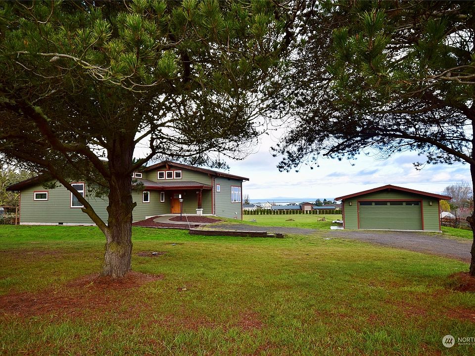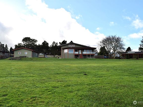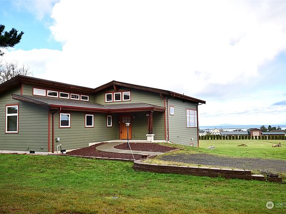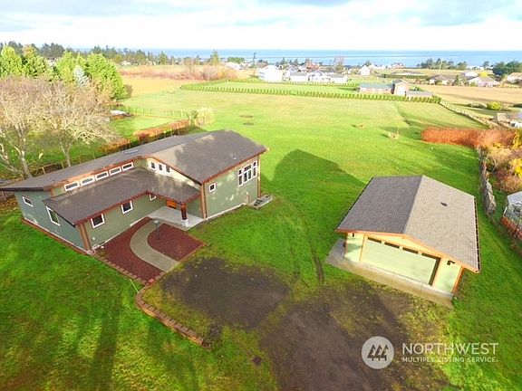 Fabulous home on 2 acres with panoramic water view of the Strait of Juan de Luca, from Victoria to Mt Baker. Custom features throughout. Large, no step, open floorplan great room has water view kitchen with lots of storage space & huge walk-in pantry. Beautiful, wood wrap view windows in the main living area & master bedroom. Art gallery hallway. Stunning bathrooms, small office room & large extra room. Basement has been shop. Finished garage has 220, 30 amp & exhaust fan for welding.