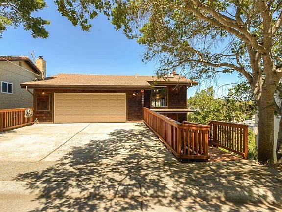 Breathtaking, Panoramic Views, Open Concept, large decks, open beam ceiling, loft, skylight, Granite/ maple kitchen, dining/ living great room with fireplace on top floor. 4 bedrooms, 3 with sliding glass doors to deck and views. Third floor down is a family room w/ fireplace, large closet, separate bathroom, sliding glass door to deck. An almost level driveway provide ease of access from car to kitchen and an oversize garage with cabinets, large work benches and stairs to attic provide plenty of storage. Walk in basement below, with windows, dirt floor, allows for storage. Quiet, convenient location, houses on just one side of street, here. Unobstructed views, stairs and hall are 4' wide. Large front redwood deck, 10' x 20', plus 2 rear decks spanning back of house 40' x 6' and 12' x 4' deck on 3rd level. New carpet, paint throughout, new showers, toilets and bathtubs in some of the bathrooms as well.