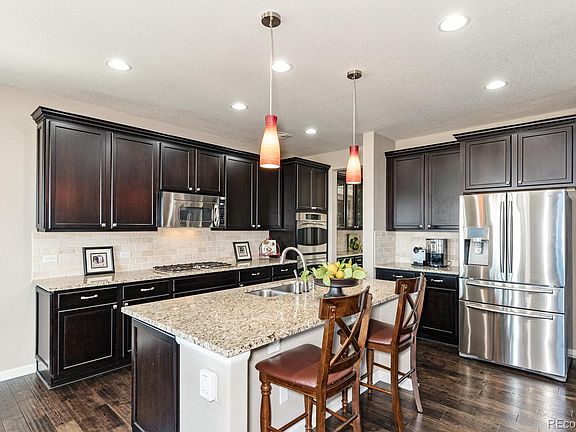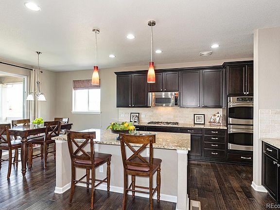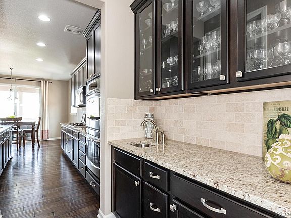 Enjoy far reaching views while sitting at the top of Castle Rock! This walk out Dillon floorplan is a fan favorite with a bay window at the dining room adding space and light, a butlers pantry and large walk in pantry between the dining room and the gourmet kitchen. The 2 story great room has lots of light a gas fireplace and upgraded media built-ins. The study with French door entry is presently being used as a quilting room. The master suite has a conferred ceiling, private 5 piece bath with soaking tub and walk in shower. Three secondary bedrooms also on the upper level, two with shared bath and one with en-suite bath. Finished basement includes large rec room, bedroom, bath, storage rooms and theater room. Exterior living is enjoyed on the covered deck and the professionally landscaped yard with a flat grassy area. Views of the Rock means you will enjoy fireworks from your deck. Its a short drive to Old Town Castle Rock where you will enjoy great dining (take out for now!) and shopping. Video walk through is available.
